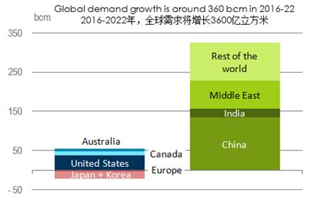 在供應方面,美國現在已經是世界上最大的天然氣生產國,美國目前的增長速度也是全球最高的,到2022年,美國將占全球產量增長的40%。此外,中東地區產量將繼續增長;中國也將成為第四大天然氣生產國。