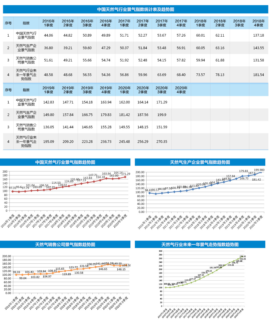 西南石油大學經濟管理學院四川石油天然氣發展研究中心沈西林研究團隊設計的"中國天然氣行業景氣指數",于2016年4月23日由西南石油大學和中國能源網聯合向社會公眾正式發布,自此以后每季度發布一次,即每年1月18日、4月18日、7月18日、10月18日發布。