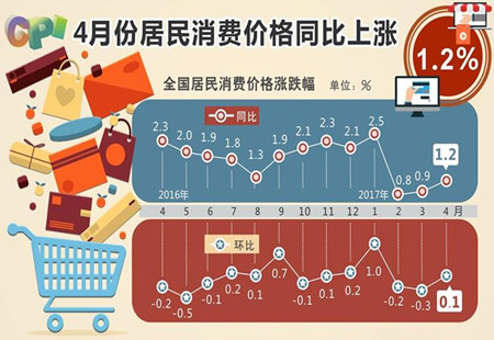 4月CPI同比漲幅擴大 PPI環比由升轉降國家統計局今天發布的2017年4月份全國居民消費價格指數(CPI)和工業生產者出廠價格指數(PPI)數據顯示,CPI環比上漲0.1%,同比上漲1.2%;PPI環比下降0.4%,同比上漲6.4%。對此,國家統計局城市司高級... [詳細]