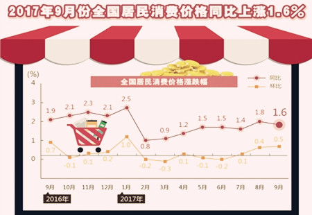 國家統(tǒng)計局:9月份CPI同比上漲1.6%2017年9月份,全國居民消費價格同比上漲1.6%。其中,城市上漲1.7%,農(nóng)村上漲1.4%;食品價格下降1.4%,非食品價格上漲2.4%;消費品價格上漲0.7%,服務(wù)價格上漲3.3%。1-9月平均,全國居民消費價格總水... [詳細(xì)]