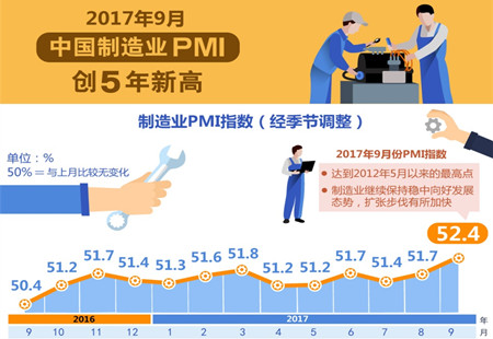 9月中國制造業(yè)PMI為52.4% 創(chuàng)近年新高據(jù)統(tǒng)計局網(wǎng)站消息,2017年9月份,中國制造業(yè)采購經(jīng)理指數(shù)(PMI)為52.4%,比上月上升0.7個百分點,制造業(yè)繼續(xù)保持穩(wěn)中向好的發(fā)展態(tài)勢,擴(kuò)張步伐有所加快。 [詳細(xì)]