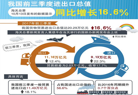 前三季度進(jìn)口增22.3% 出口增12.4%10月13日上午,海關(guān)總署新聞發(fā)言人黃頌平在發(fā)布會介紹2017年前三季度進(jìn)出口情況。據(jù)海關(guān)統(tǒng)計,前三季度,我國貨物貿(mào)易進(jìn)出口總值20.29萬億元人民幣,比去年同期增長16.6%。其中,出口11.16萬億元,增長12.4%... [詳細(xì)]