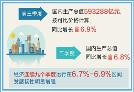 前三季度中國經(jīng)濟(jì)同比增長6.9% 穩(wěn)中向好國家統(tǒng)計局19日發(fā)布數(shù)據(jù),初步核算,今年前三季度國內(nèi)生產(chǎn)總值(GDP)同比增長6.9%,其中,第三季度GDP同比增長6.8%,經(jīng)濟(jì)連續(xù)9個季度運行在6.7%至6.9%的區(qū)間,保持中高速增長。 [詳細(xì)]