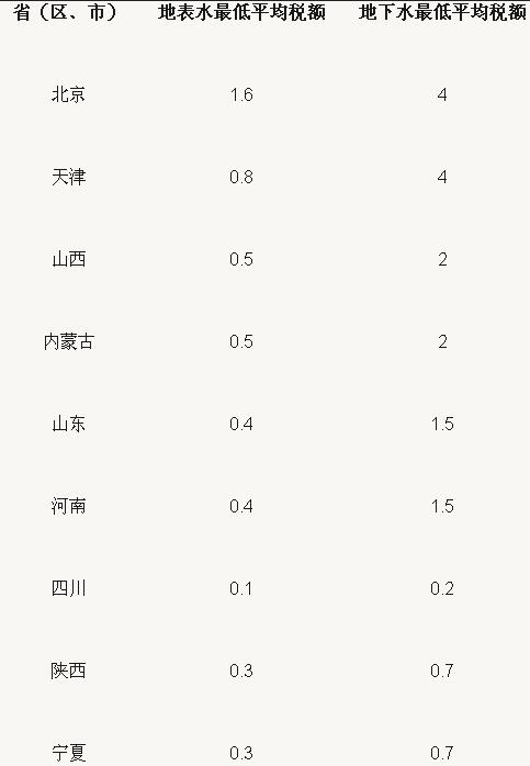 第九條 除中央直屬和跨省(區(qū)、市)水力發(fā)電取用水外,由試點省份省級人民政府統(tǒng)籌考慮本地區(qū)水資源狀況、經(jīng)濟(jì)社會發(fā)展水平和水資源節(jié)約保護(hù)要求,在本辦法所附《試點省份水資源稅最低平均稅額表》規(guī)定的最低平均稅額基礎(chǔ)上,分類確定具體適用稅額。