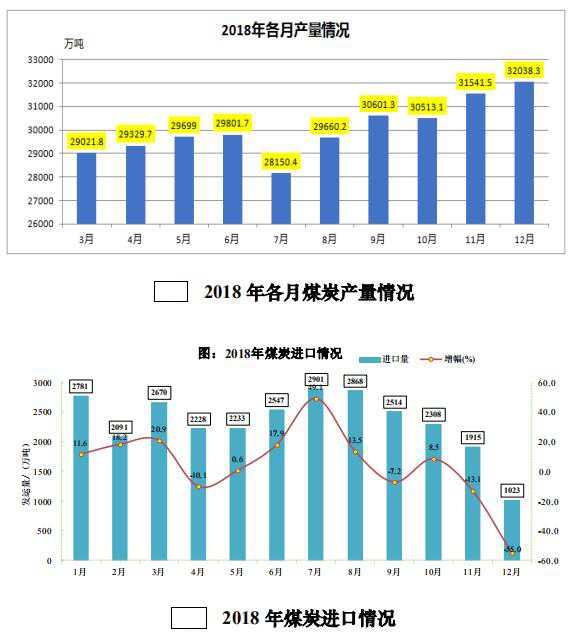 一是產量增加。2018 年全國原煤產量 36.8 億噸,同比增長 4.5%。二是進口量增加。2018年全國煤炭進口 2.81 億噸,同比增長 3.9%;出口 493.4 萬噸,同比下降 39%;凈進口 2.76 億噸,同比增長 5.2%,為近四年來最高水平。三是煤炭轉運量增加。2018 年全國鐵路累計煤炭運輸量完成 23.81 億噸,同比增長 10.3%。主要港口發運煤炭 8.1 億噸,同比增長 7.5%。