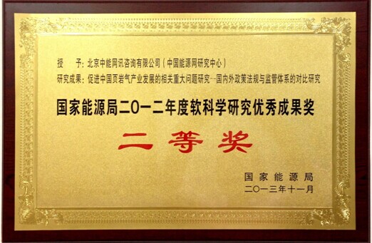 國家能源局授予北京中能網(wǎng)訊咨詢有限公司(中國能源網(wǎng)研究中心)促進(jìn)中國頁巖氣發(fā)展相關(guān)重大問題研究——國內(nèi)外政策法規(guī)與監(jiān)管體系對比研究“國家能源局2012年度軟科學(xué)研究優(yōu)秀成果獎(jiǎng)”