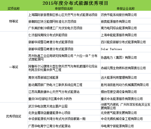 為肯定和表彰本年度在中國(guó)分布式能源領(lǐng)域做出突出貢獻(xiàn)的企業(yè)與個(gè)人,由中國(guó)能源網(wǎng)發(fā)起、會(huì)議主辦方大力支持的“2015(第十一屆)分布式能源國(guó)際論壇獎(jiǎng)項(xiàng)評(píng)選”活動(dòng)結(jié)果在會(huì)議期間正式公布。獎(jiǎng)項(xiàng)分為:2015年度中國(guó)分布式能源優(yōu)秀項(xiàng)目獎(jiǎng)、優(yōu)秀設(shè)計(jì)單位獎(jiǎng)、杰出貢獻(xiàn)人物獎(jiǎng)。