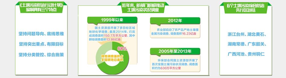 建設(shè)綜合防治先行區(qū)。2016年底前,在浙江省臺州市、湖北省黃石市、湖南省常德市、廣東省韶關(guān)市、廣西壯族自治區(qū)河池市和貴州省銅仁市啟動土壤污染綜合防治先行區(qū)建設(shè),重點在土壤污染源頭預(yù)防、風(fēng)險管控、治理與修復(fù)、監(jiān)管能力建設(shè)等方面進行探索,力爭到2020年先行區(qū)土壤環(huán)境質(zhì)量得到明顯改善。有關(guān)地方人民政府要編制先行區(qū)建設(shè)方案,按程序報環(huán)境保護部、財政部備案。京津冀、長三角、珠三角等地區(qū)可因地制宜開展先行區(qū)建設(shè)。(環(huán)境保護部、財政部牽頭,國家發(fā)展改革委、國土資源部、住房城鄉(xiāng)建設(shè)部、農(nóng)業(yè)部、國家林業(yè)局等參與)